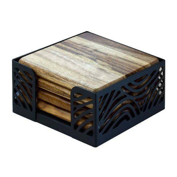 - An elegant metal stand showcases your logo and keeps the coasters handy for use.